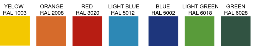 Our standard colours (with the closest RAL match), which can be combined freely.